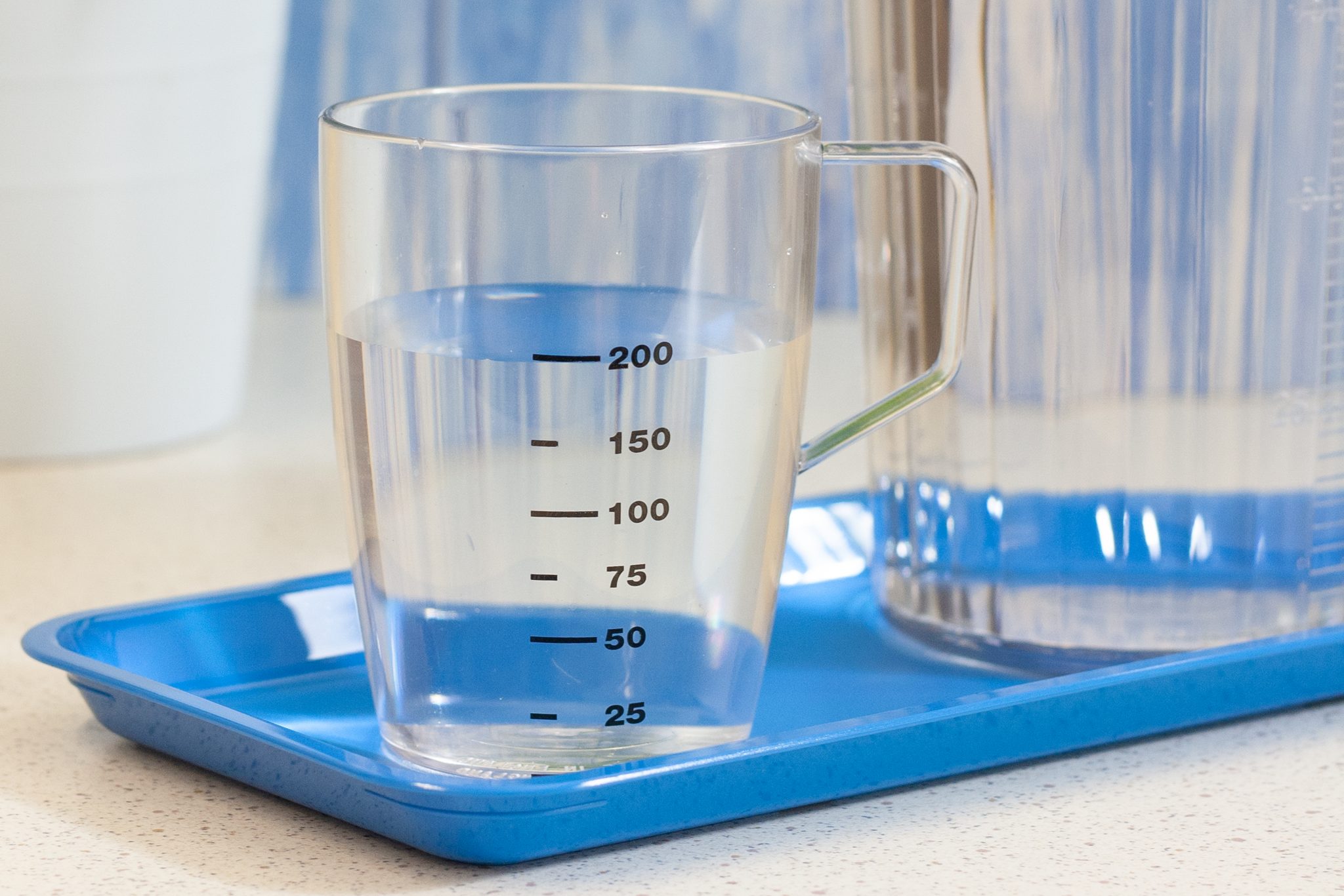 Microwave safe for reheating drinks or soup. Also dishwasher safe and highly stain resistant. There is also a graduation every 2.5cl from 25ml to 200ml on the beaker for measuring the contents of it or fluid intake control if necessary.
