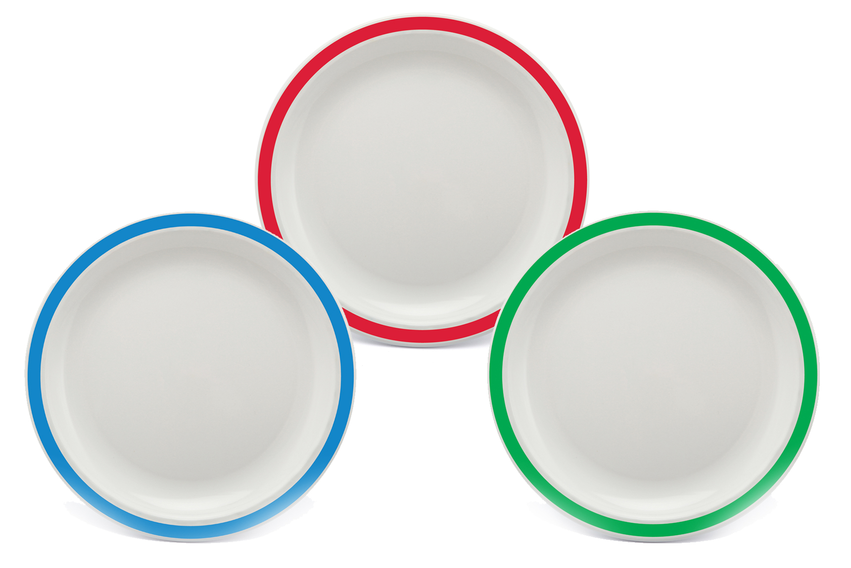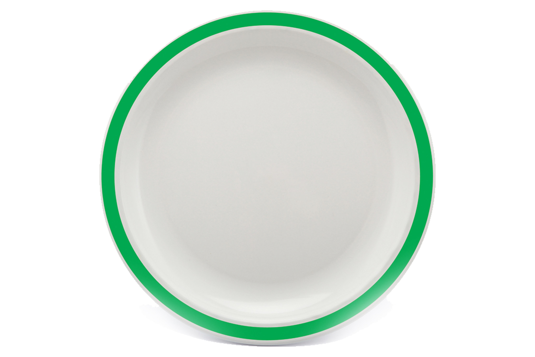 This Copolyester Duo Dinner Plate is available in white with a solid colour band around the rim. Choose between vibrant red, emerald green and blue shade.