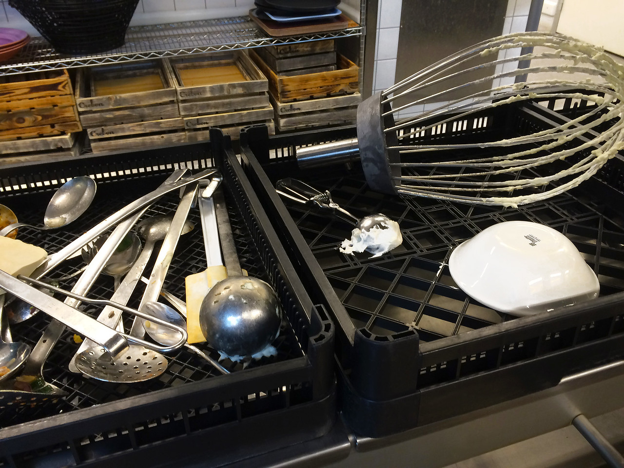This dishwasher rack has a large meshed bottom (3x3cm). It comes in black colour.