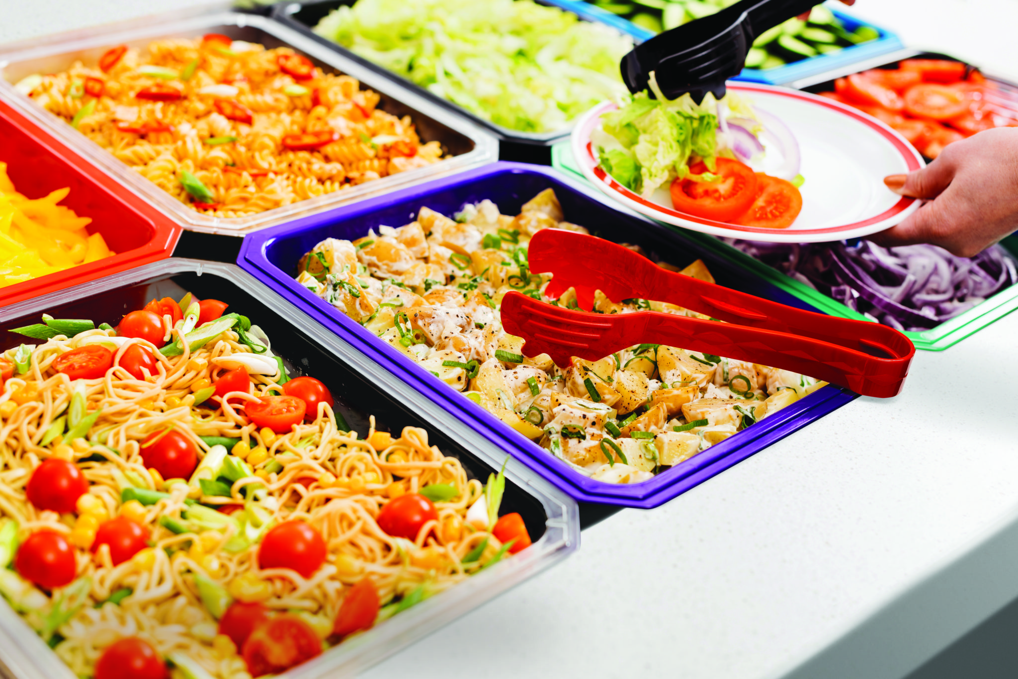The available range of colour aids to differentiate between various uses. For example, green to use with salads, red to use with cooked meat, yellow for pasta dishes etc. They can also be very handy to identify special diets and food intolerances.