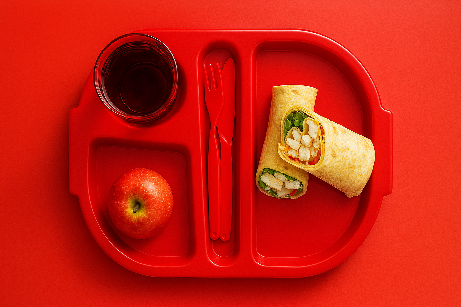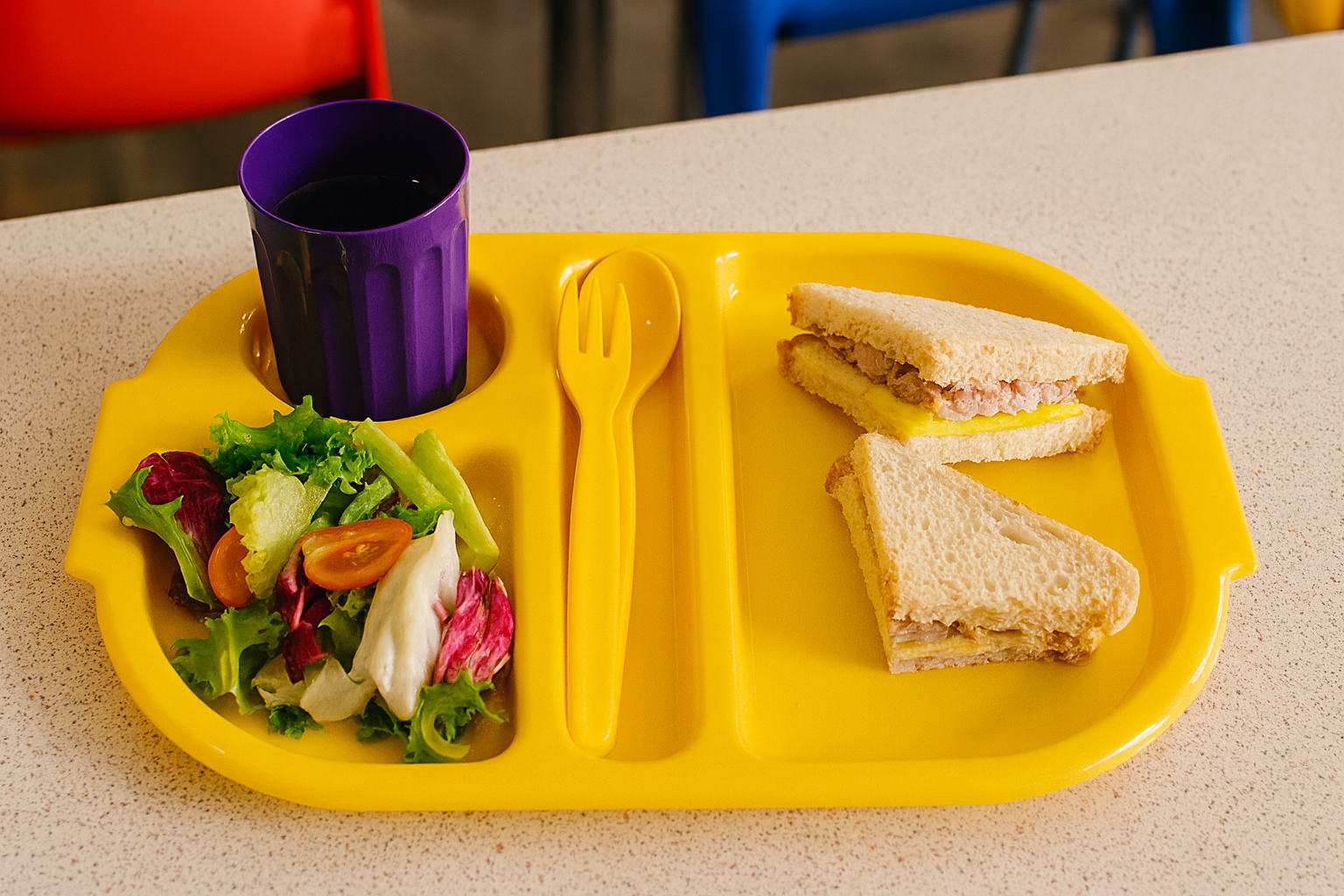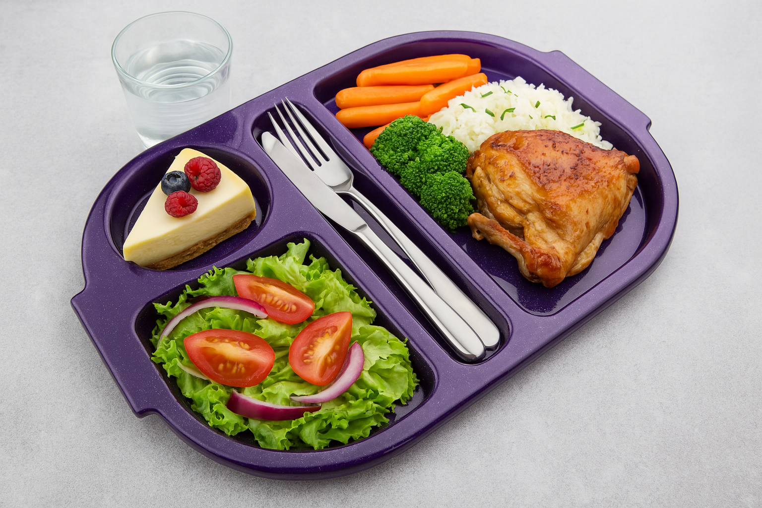 The tray is split into 4 compartments – The main section is dedicated for main meals, a round compartment for a drink tumbler, another one for a set of cutlery and one approximately 3/4 of the size of the largest compartment, ideal for desserts. It can also serve as a section for a side dish or fruit etc. The design helps reduce queuing times by eliminating multiple trips to serving areas.