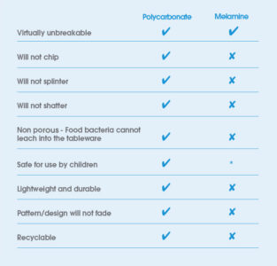 * Polycarbonate is safe for use by children as it will not shatter or splinter. Melamine may shatter into sharp pieces and become a health and safety hazard. When melamine chips it will become unhygienic as food and bacteria etc can seep into the porous material through the chip and will be harboured in the product.